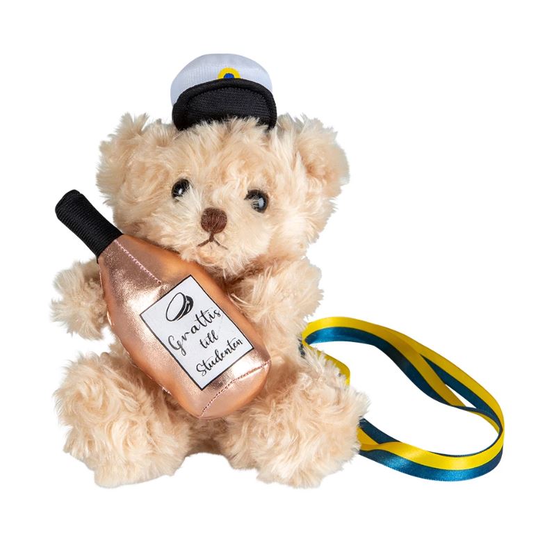 Fira studentdagen med denna klassiska och charmiga studentnalle i form av en beige nallebjörn! Den mjuka nallen bär en traditionell studentmössa och håller i en rosa bubbelflaska med texten "Grattis till studenten". Perfekt att hänga runt halsen på den nybakade studenten som ett minnesvärt och festligt studenthänge.