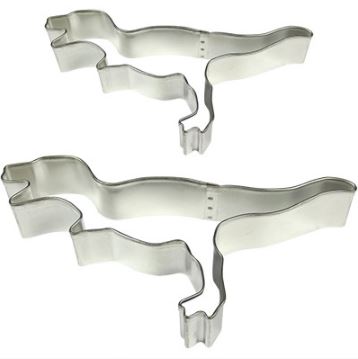 Utstickare, cookie cutters, för att skära ut dinosaurier i två olika storlekar. Använd för att skapa dekorationer av sockerpasta och marsipan eller varför inte baka dino-formade kakor. Utstickarna är tillverkade av rostfritt stål.