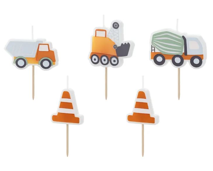 Tårtljus i 5-pack till fordonsfantasten. I kitet ingår två koner, en lastbil, en cementblandare och en grävmaskin. En perfekt dekoration till födelsedagstårtan med fordonstema.