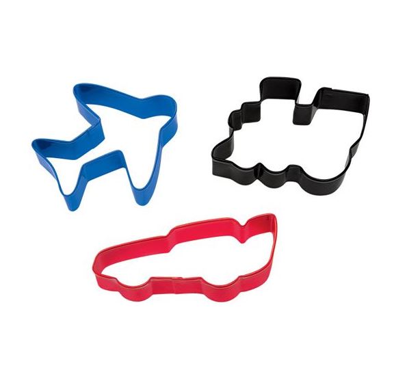 Set med tre cookie cutters från Wilton, perfekt för fordonsentusiasten. Utstickarna är gjorda av metall för exakta snitt. I setet ingår ett flygplan, ett tåg och en racerbil.