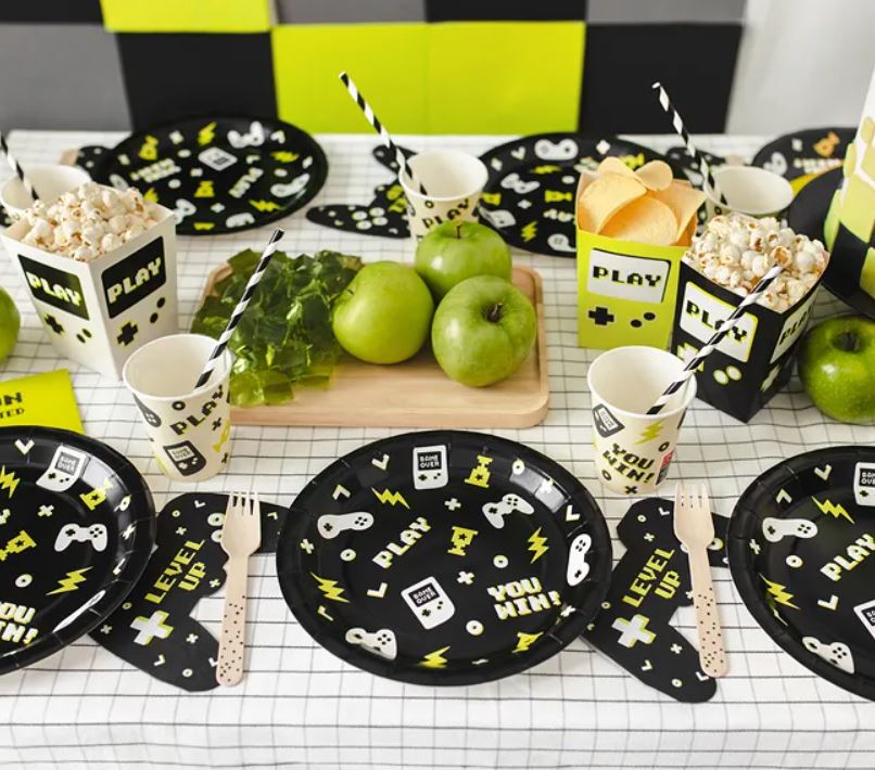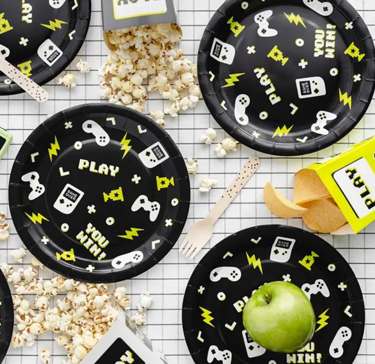 Papperstallrikar till kalaset med gaming-tema. Tallrikarna är svarta med tryck av olika tv-spelssymboler.
