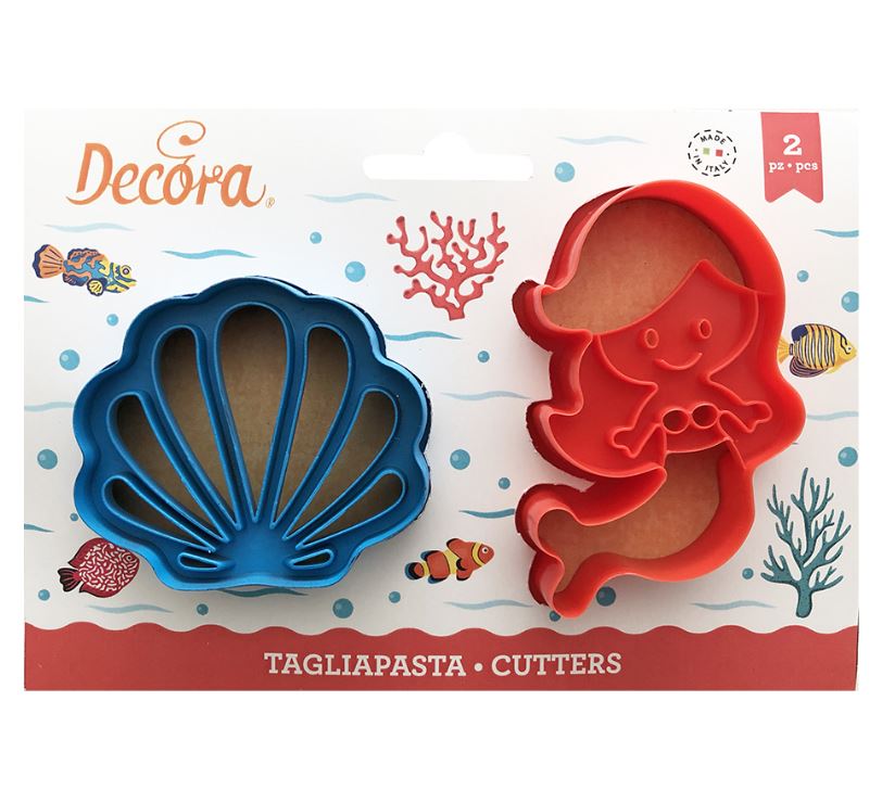 Set med två cookie cutters av plast för att skära ut perfekta former ut kakdeg, sockerpasta, marsipan och andra ätbara massor. Just det här setet skapar en sjöjungfru och ett snäckskal. Utstickarna har också tillhörande mönsterprägling som skapar detaljer i degen samtidigt som du skär ut formen. För att få jämnare kanter kan du mjöla formen innan användning.