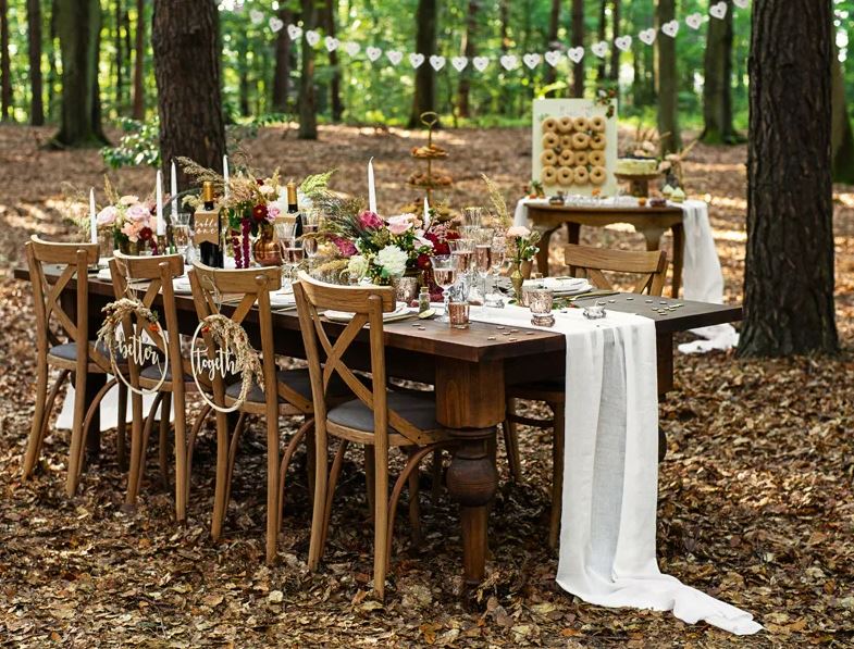 Elegant bordsduk i muslintyg – perfekt för bröllop och fest.