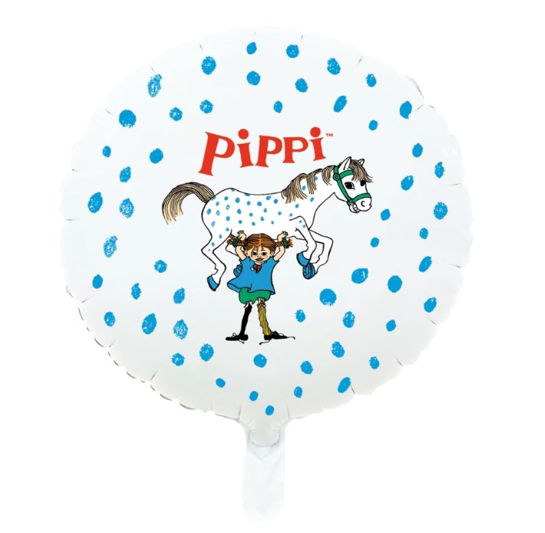 Rund folieballong med Pippi Långstrump-motiv! Den vita ballongen är prydd med blå prickar och passar perfekt för ett födelsedagskalas med Pippi-tema. Matcha gärna med övriga Pippi-produkter.
