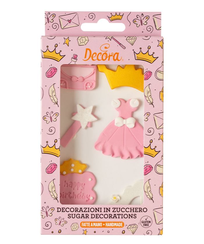 Söta sockerdekorationer i form av olika prinsessymboler – perfekta för att ge en sagolik och lekfull touch till födelsedagstårtor, cupcakes, kakor och andra bakverk. Varje dekoration är handgjord och färgad med naturligt utvunna färgämnen. Förpackningen innehåller 6 stycken dekorationer på prinsesstemat.