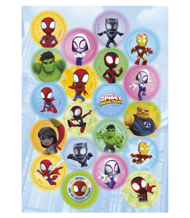Waferark med karaktärer från Marvels Spidey. Perfekt för att dekorera tårtor, cupcakes och andra bakverk på superhjältekalaset.
