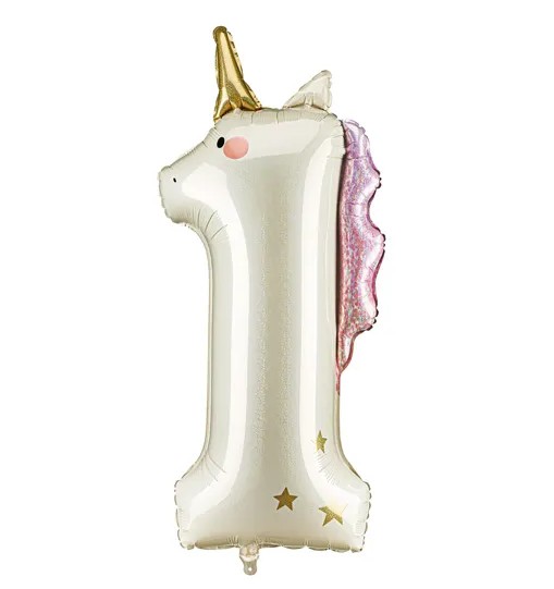 Skapa en magisk stämning på födelsedagsfirandet med denna skimrande sifferballong i form av en enhörning. Ballongen är gräddvit med holografisk effekt och detaljer i rosa och guld.