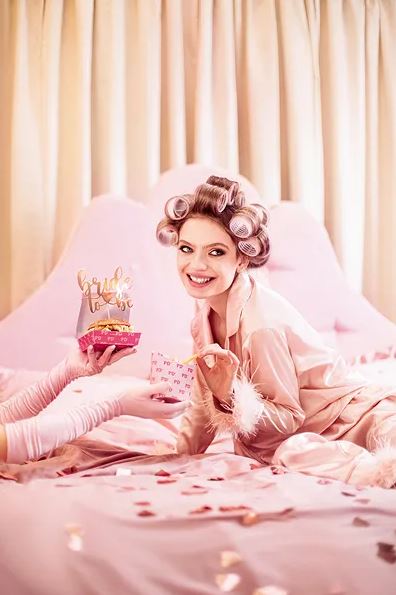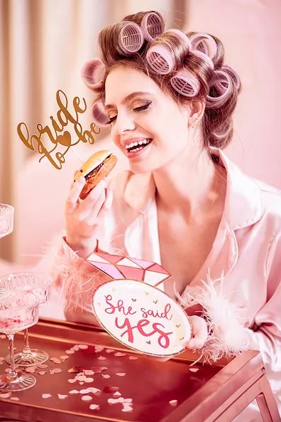 Juhlallinen kakunpäällinen kanajuhliin. Teksti "Bride to be" on kirjoitettu kiiltävällä ruusukullatalla.