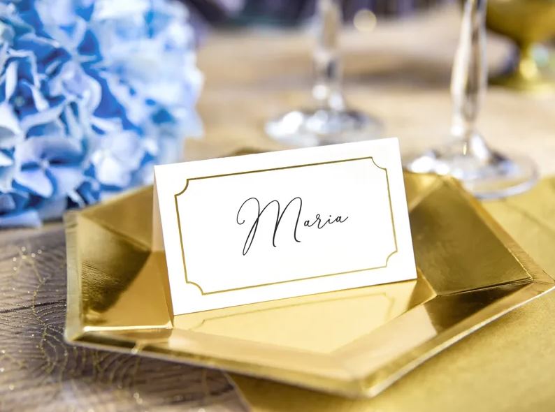 Tyylikkäät paikkakortit häihin ja juhliin. Kortit on valmistettu valkoisesta paperista ja niissä on kultainen reunus.