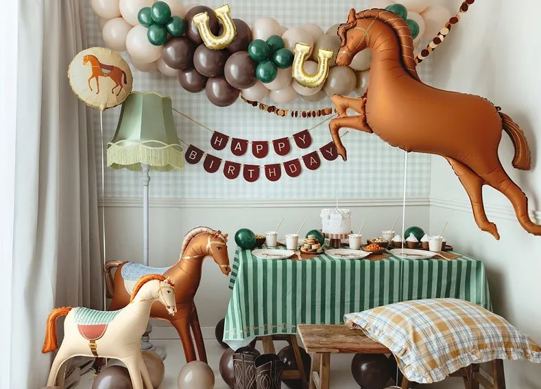 Suuri foliopallo hevosteemaisiin juhliin! Pallo esittää hyppäävää hevosta ja on peräti 125 x 100 cm kokoinen. Yhdistä rohkeasti muihin saman juhlateeman tuotteisiin.