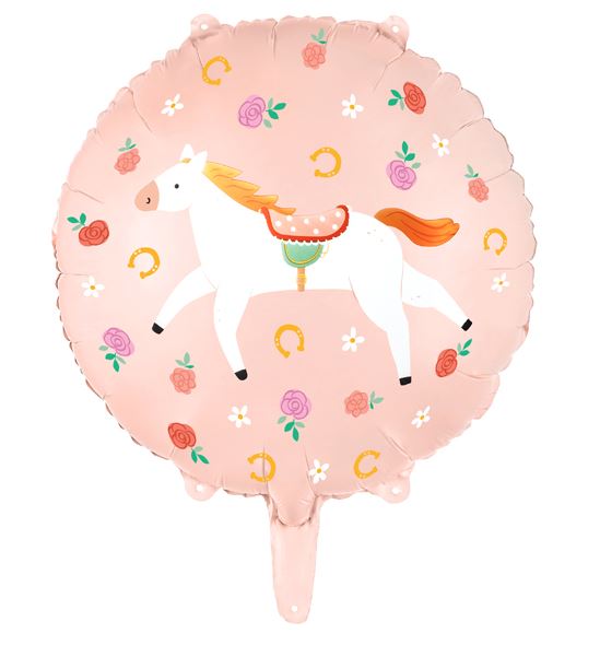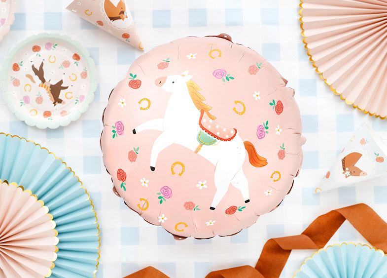 Folioilmapallo juhliin hevosteemalla. Ilmapallo on vaaleanpunainen hevoskoristeilla, n. 35 cm.Voit vapaasti yhdistää muihin saman malliston tuotteisiin.