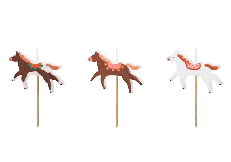 Kakkukynttilöitä 3 kpl:n pakkauksessa kaikille hevostytöille ja hevospojille. Täydellinen koriste hevosaiheiseen syntymäpäiväkakkuun. Voit vapaasti yhdistää muihin hevossarjan tuotteisiin