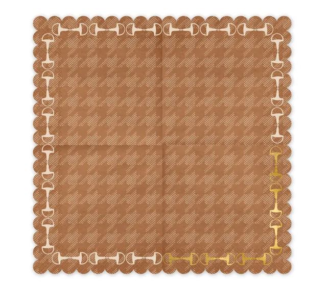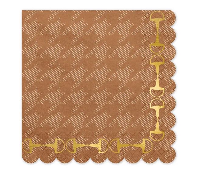 Ruskeat paperiservetit, joissa on klassinen koiranhammaskuvio ja kultaväriset jalustimet kehystämässä – täydelliset tyylikkääseen kattaukseen hevosteemaisiin juhliin. Servettien koko on noin 33 x 33 cm avattuna ja noin 16,5 x 16,5 cm taitettuna.