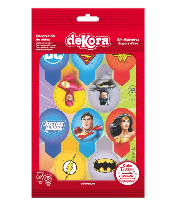Waferarkki, jossa on useita eri DC Comics Justice League -hahmoja – täydelliset koristeet kakuille, kuppikakuille ja muille leivonnaisille supersankarijuhliin! Jokainen koriste on noin 6,5 cm korkea ja 4 cm leveä.