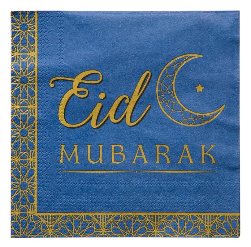 Siniset servetit, joissa on teksti "Eid Mubarak" – täydellinen yksityiskohta luomaan juhlavaa tunnelmaa Eid-juhlaan. Nämä servetit sopivat erinomaisesti kattaukseen ja voidaan yhdistää muihin koristeisiin yhtenäisen juhlatunnelman luomiseksi.