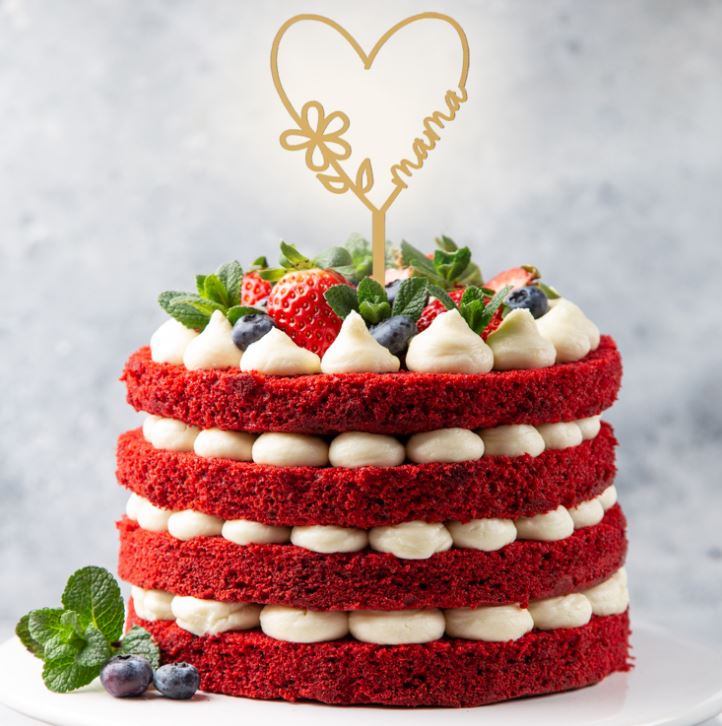 Sydämenmuotoinen cake topper Dekoralta, jossa teksti "mama".Cake topper on valmistettu muovista ja valmis asetettavaksi suoraan kakkuun. Täydellinen koriste äitienpäiväkakkuun ja muihin leivonnaisiin äidille! Sydämen leveys on noin 11 cm.