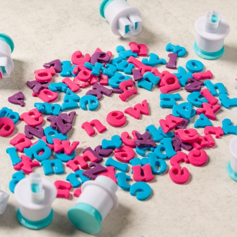 Anna kakuille, cupcakeille ja kekseille persoonallinen viimeistely LOYAL Plunger Cutter set Mini Alphabet -setillä. Näillä muoteilla luot helposti tarkat ja yksityiskohtaiset kirjaimet ja tekstit sokerimassasta, gum paste -massasta ja keksitaikinasta.