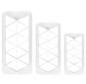 3 muovileikkuria kolmion muotoisten keksitaikinan, sokeritahnan, marsipaanin, kumitahnan jne.