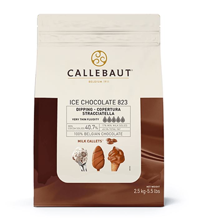 Ice Chocolate 823 perustuu Callebaut'n alkuperäiseen reseptiin, ja se on jalostettu gelaton ja jäätelön valmistajia varten. Korkean fluiditeetin ansiosta tämä jäätelösuklaa sopii täydellisesti jäätelöpuikkojen kastamiseen ja stracciatellan valmistukseen. Täydellisen tasapainoisen ja pyöreän maun saavuttamiseksi sekoitus koostuu kaakaopavuista kolmesta eri alkuperämaasta: Norsunluurannikolta, Ghanasta ja Ecuadorista.