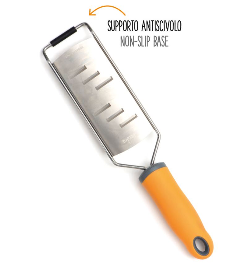 Leveä teräsuunnittelu sopii erityisen hyvin suklaan, juuston, hedelmien ja muiden elintarvikkeiden raastamiseen koristeellisiksi lastuiksi.
