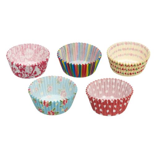 Söpöt muffinssimuotit suuressa pakkauksessa Sweetly Does It -yrityksestä. Muffinssivuokia on saatavilla viidessä eri mallissa, joissa on kukkia, pisteitä ja raitoja. Ne on valmistettu paperista, jossa on rasvan kestävä pinnoite, jonka ansiosta leivonnaiset on helppo irrottaa muotista tarttumatta kiinni.