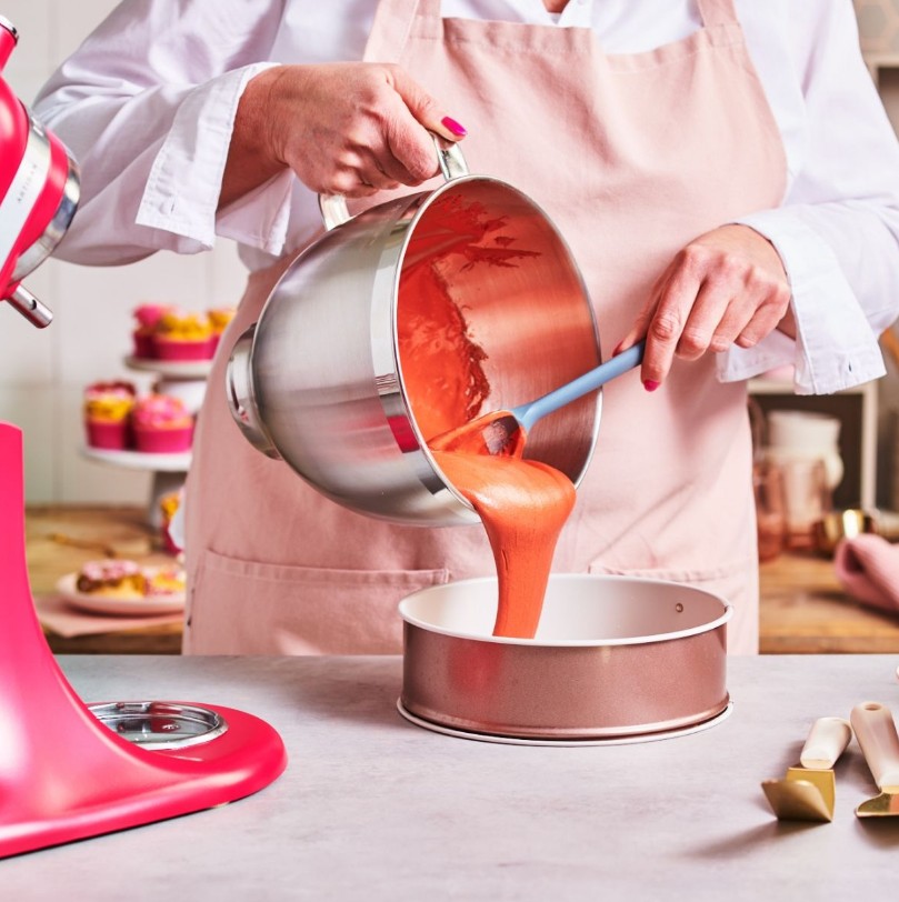 - Esilämmitä uuni 175°C (kiertoilmauuni 160°C). Ainesosien tulisi olla huoneenlämpöisiä. Sekoita mix, vesi, munat ja kasviöljy kulhossa ja vatkaa 6–8 minuuttia kevyeksi taikinaksi. Kaada taikina voideltuun vuokaan (½–⅔ täytettynä) ja paista kakkua uunissa.