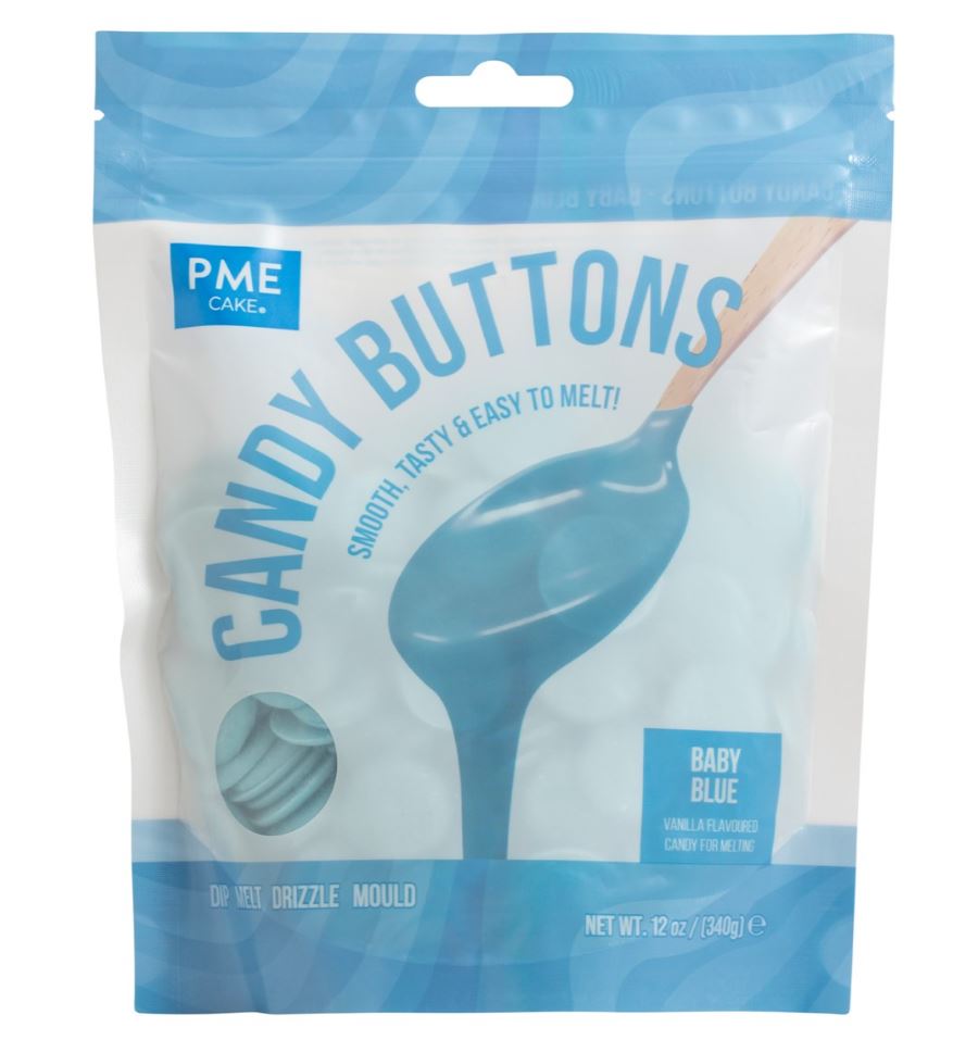 PME:n vaaleansiniset Candy Buttons herkullisella vaniljan maulla. Nämä suklaakaramellit sulavat helposti ja sopivat täydellisesti drip-efektien tekemiseen kakuille, makeisten dippaamiseen, cake popsin kuorruttamiseen, suklaamuottien täyttämiseen tai jälkiruokien ja hedelmien koristeluun.