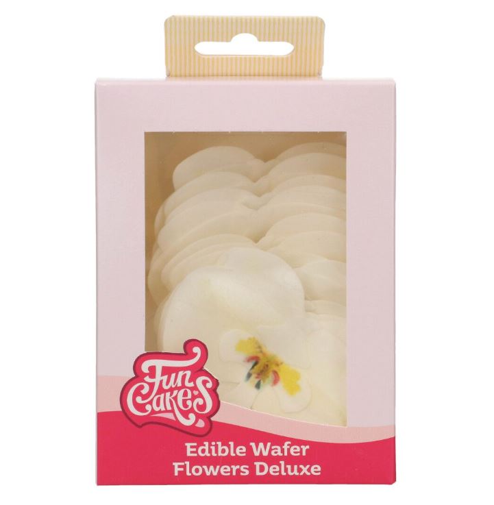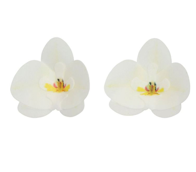 Syömäkelpoiset valkoiset orkideat, jotka on valmistettu vohvelipaperista. Kukat ovat kokonaiset 8,45419,5 cm:n kokoisia ja kauniita käytettäväksi hääkakun, syntymäpäiväkakun jne. koristeena.