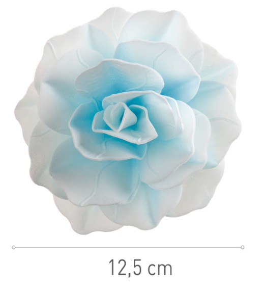 Koristele hääkakku tai muut elegantit leivonnaiset upealla vaaleansinisellä vohvelikukkaruusulla. Ruusun koko on noin 12,5 cm, ja se viimeistelee minkä tahansa kakun. Vohvelipaperi on mauton mutta täysin syötävä.