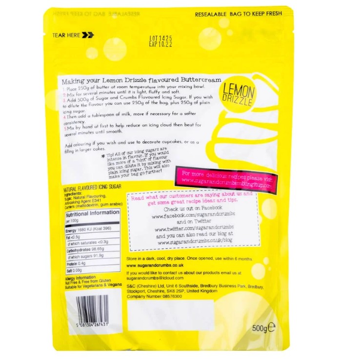 Sugar & Crumbs sitruunamakuinen tomusokeri. Maustettu tomusokeri sopii täydellisesti käytettäväksi voikreemissä, marengeissa, macarons-leivonnaisissa, juustokakuissa ja muissa leivonnaisissa. Vaihda reseptin tavallinen sokeri tai tomusokeri tähän maustettuun tomusokeriin – helppo tapa saada sekä makeutta että makua yhdellä kertaa.