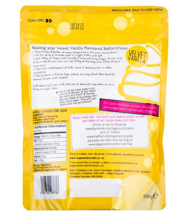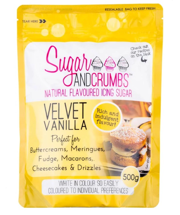 Sugar & Crumbs vaniljamakuinen tomusokeri. Maustettu tomusokeri sopii täydellisesti käytettäväksi voikreemissä, marengeissa, macarons-leivonnaisissa, juustokakuissa ja muissa leivonnaisissa. Vaihda reseptin tavallinen sokeri tai tomusokeri tähän maustettuun tomusokeriin – helppo tapa saada sekä makeutta että makua yhdellä kertaa.