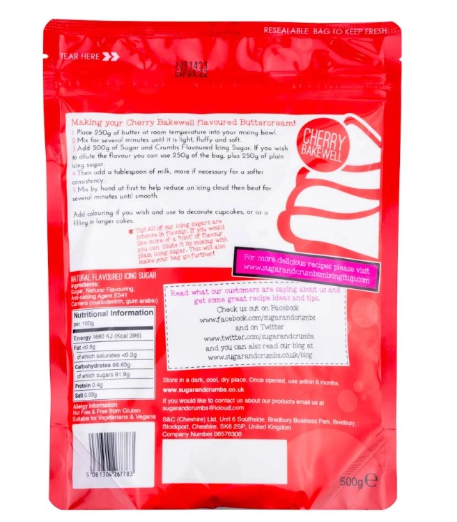 Kirsikan makuinen tomusokeri Sugar & Crumbsilta. Tämä maustettu tomusokeri sopii täydellisesti käytettäväksi voikreemissä, marengeissa, macarons-leivonnaisissa, juustokakuissa ym. Vaihda vain tavallinen sokeri tai tomusokeri maustettuun – kätevä tapa saada sekä makeutta että makua yhdellä kertaa.