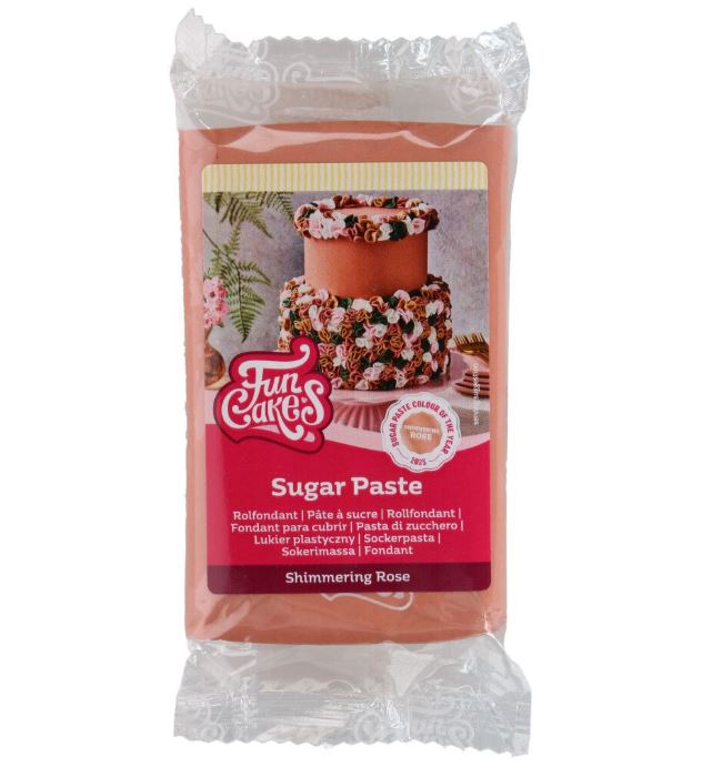 FunCakesin sokerimassa on joustava, sileä ja helppo työstettävä. Sen satiinimainen pinta tekee siitä ihanteellisen teräväreunaisille täytekakuille. Shimmering Rose vangitsee luonnon hengen ripauksella luksusta – pehmeä, "puuterimainen" ruusukulta.