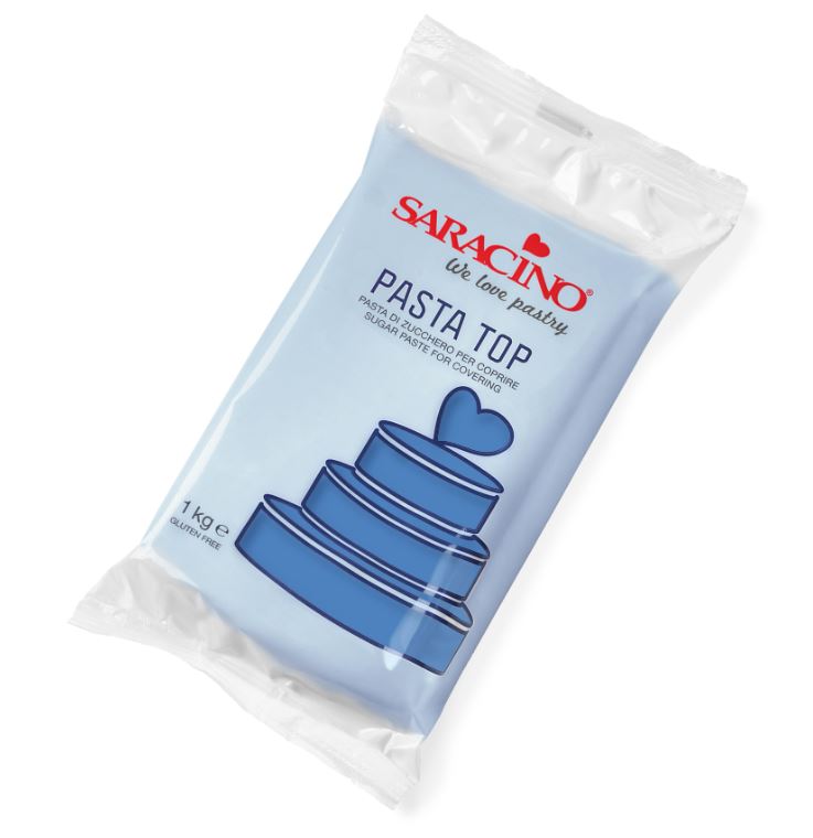 Saracino Top paste on erityisesti kehitetty kakkujen päällystämiseen. Sokerimassa on erittäin elastinen ja kestävä, ja sen voi kaulia hyvin ohueksi, jopa 1 mm:n paksuuteen. Tässä sininen väri.