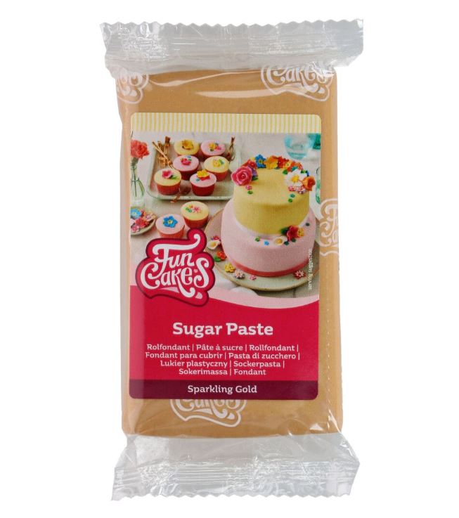 Sokerimassa FunCakesilta säihkeisellä kullanvärillä. Tämä kaunis kultainen sävy sisältää jopa kimallusta, joka näkyy myös vaivaamisen jälkeen.