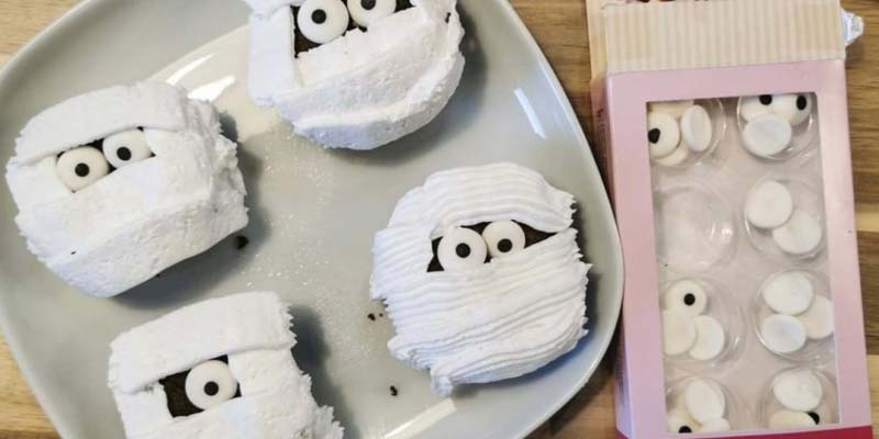 Letar du enkla recept till Halloween? Ett tips är att baka mumie-muffins. Mumiemuffins (eller mumie-cupcakes om du så vill) är chokladmuffins spritsade med vår mix för fluffig frosting. Dekorera med ett par ätbara sockerdekorationer till ögon och mumien är klar att serveras.