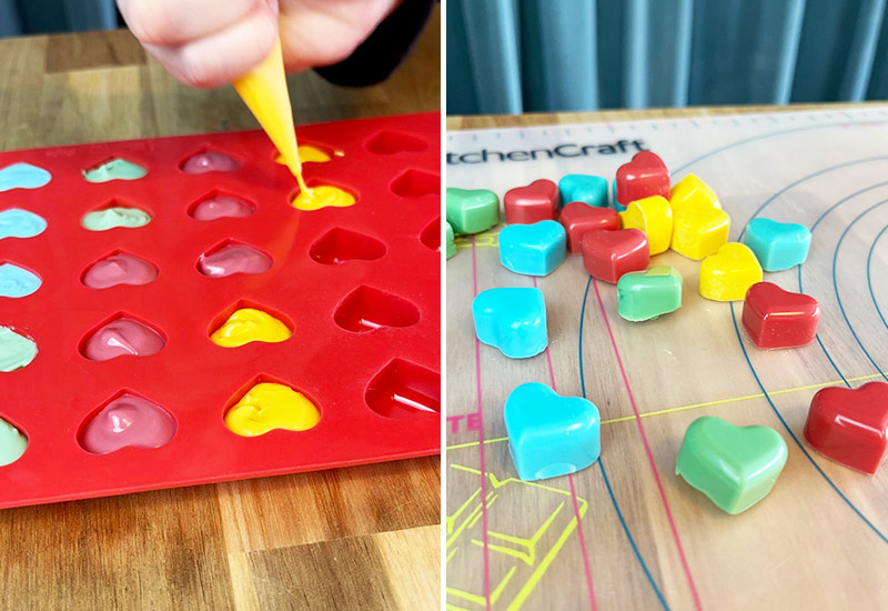 - Smält deco melts i olika färger och fyll den hjärtformade silikonformen. Låt stelna i kylen.