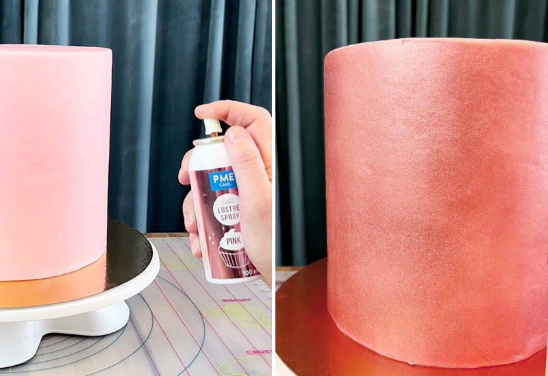 - Spraya ett jämnt lager ätbar spray på sockerpastan. Vänta en liten stund och spraya vid behov ett lager till.
