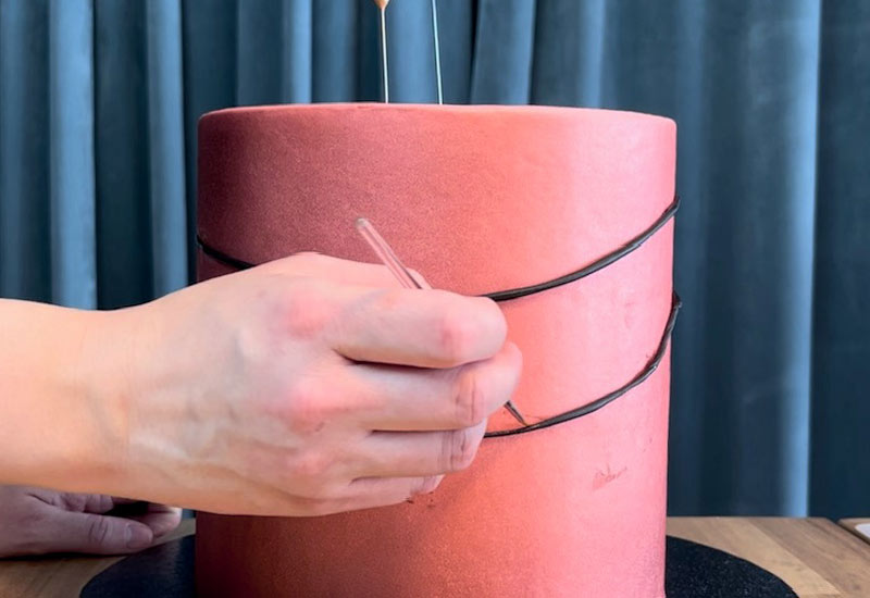 - Rulla ut 2-4 svarta remsor som ska fästas längs med tårtans sidor och vara basen för musiknoterna.