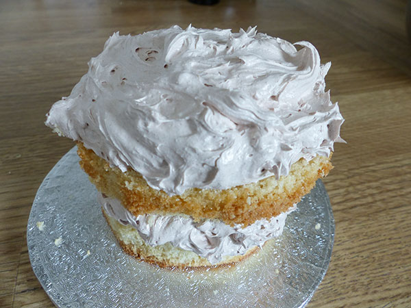 Vispa ihop en portion chokladmousse och ställ kallt i 30 minuter. Bred sedan ut ett lager på tårtan.