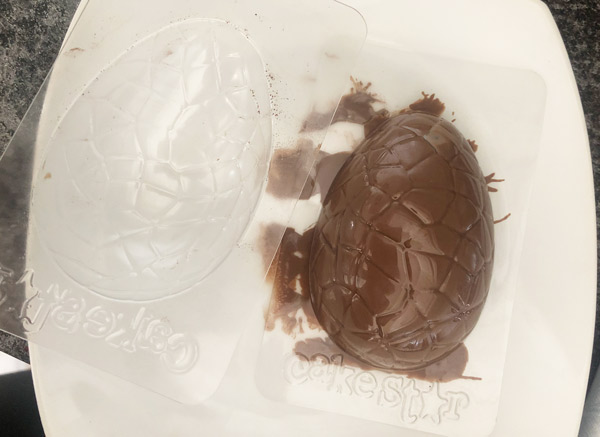 Nu kring påsktider är det lite roligt att få göra egna chokladägg! Smält candy melts och pensla i chokladäggsformarna. Låt dem sedan stelna i kylen innan du lägger dem på tårtan. Antingen låter du äggen vara som de är eller så limmar du ihop två halvor med lite smält choklad.